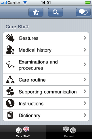 Pflegepersonal und Patient haben in separaten Menüs eigene Phrasen: